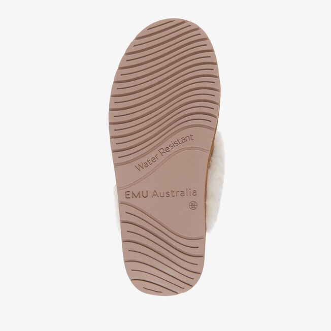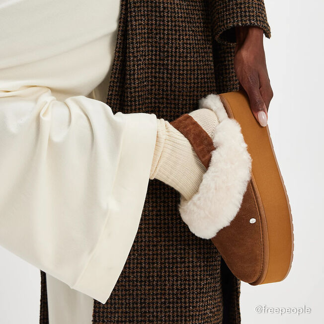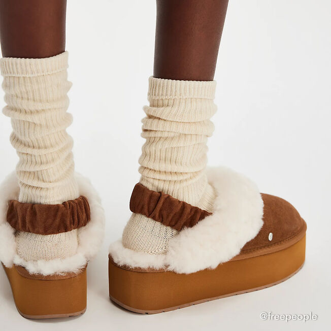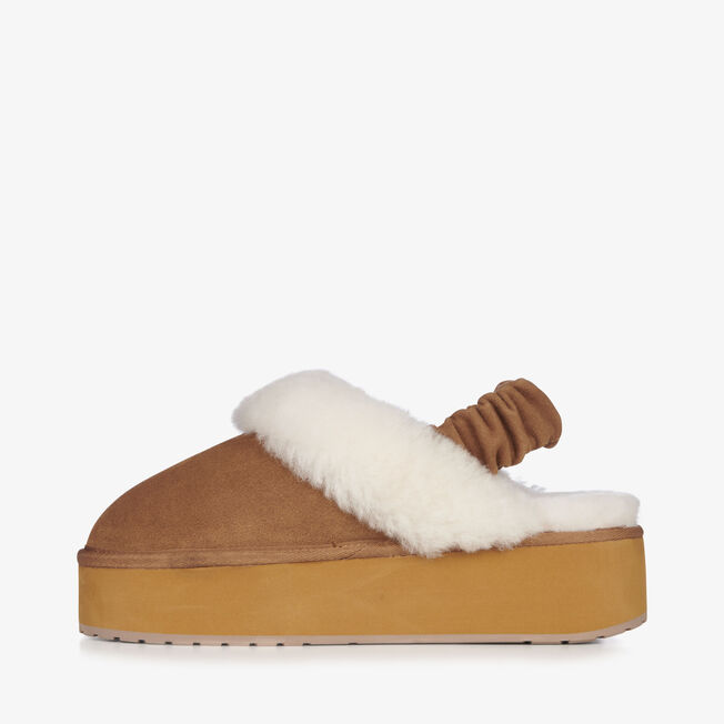 The platform sole offers extra cushioning for all-day wear, while the exposed sheepskin cuff adds a touch of luxury. The scrunchie-style ankle strap ensures a snug fit. Ideal for relaxing at home or stepping out