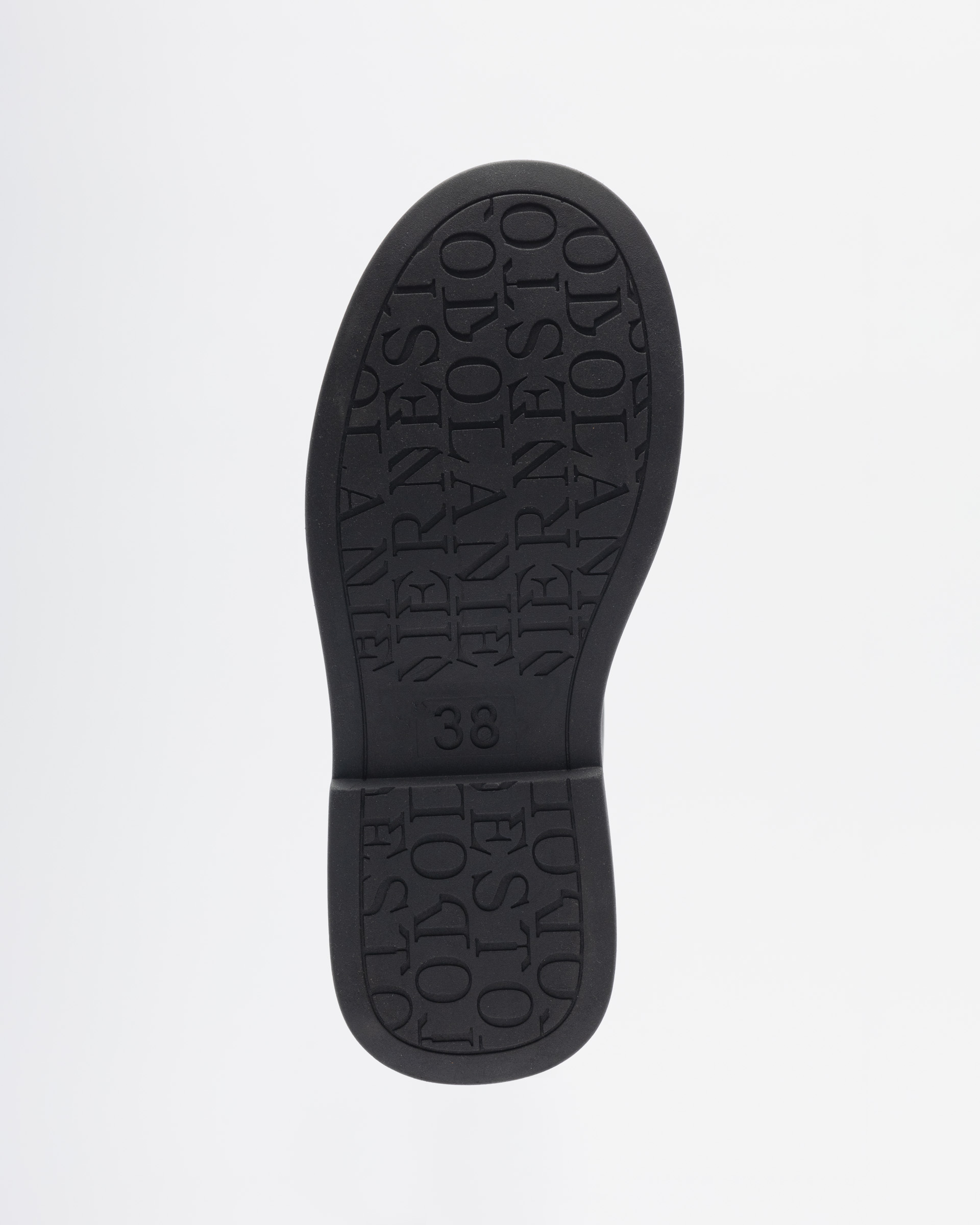 Black platform boots with interlaced laces and metal eyelets. Back zip.