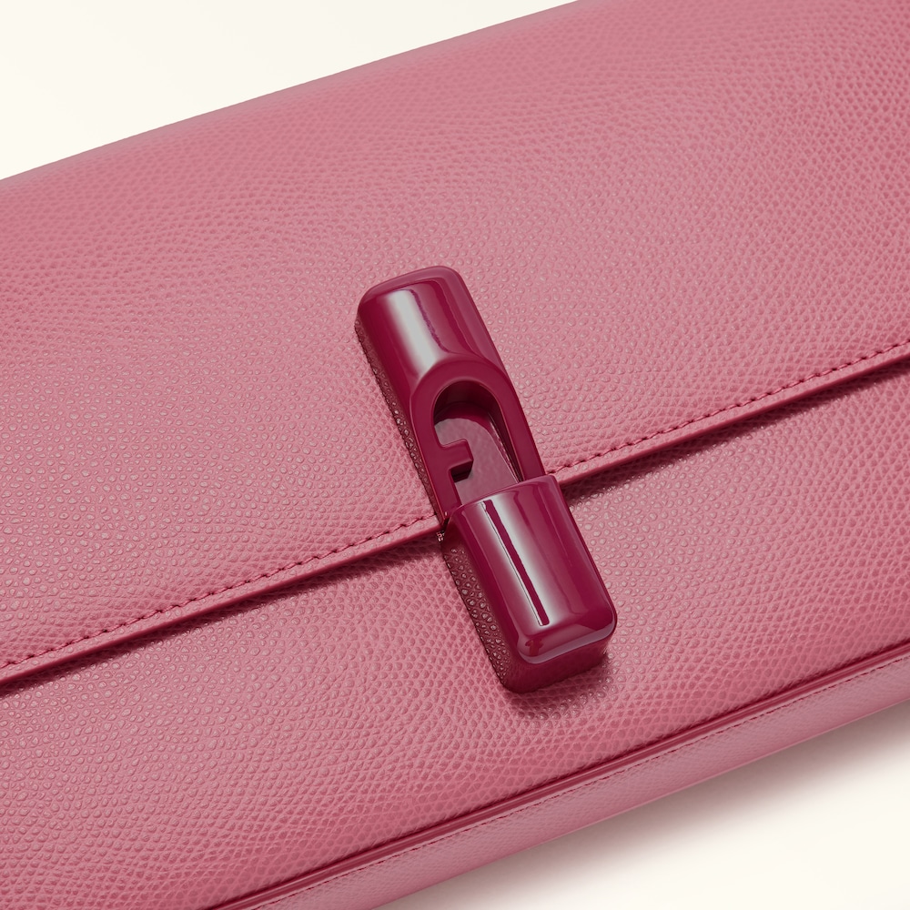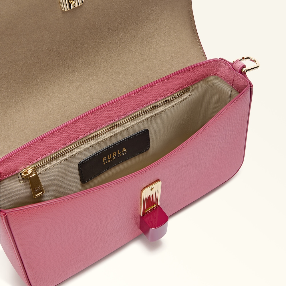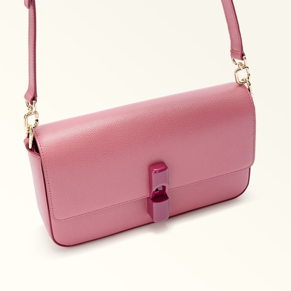 The shape of the Furla Iride crossbody is defined by its versatile, contemporary design. Its compact silhouette, in exquisite textured leather, features an adjustable and detachable shoulder strap for multiple styling options. Its magnetic closure is embellished with cylindrical metal hardware, finished with the iconic Furla Arch logo.