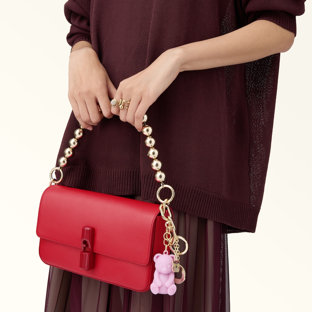 The shape of the Furla Iride crossbody is defined by its versatile, contemporary design. Its compact silhouette, in exquisite textured leather, features an adjustable and detachable shoulder strap for multiple styling options. Its magnetic closure is embellished with cylindrical metal hardware, finished with the iconic Furla Arch logo.