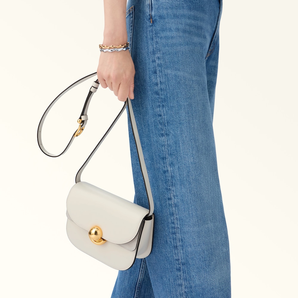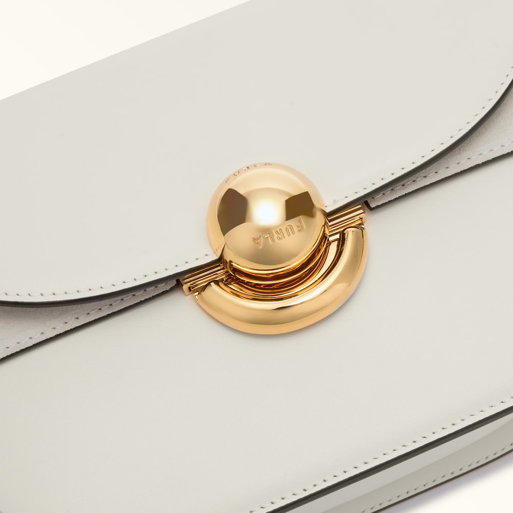 Crafted from luxurious smooth leather and finished with soft suede details on the inner flap, this Furla Sfera Crossbody features soft, sweeping lines. The front flap is embellished with the Sfera closure, an iconic signature of the Furla brand. With an adjustable matching strap, it sits comfortably on the shoulder.
