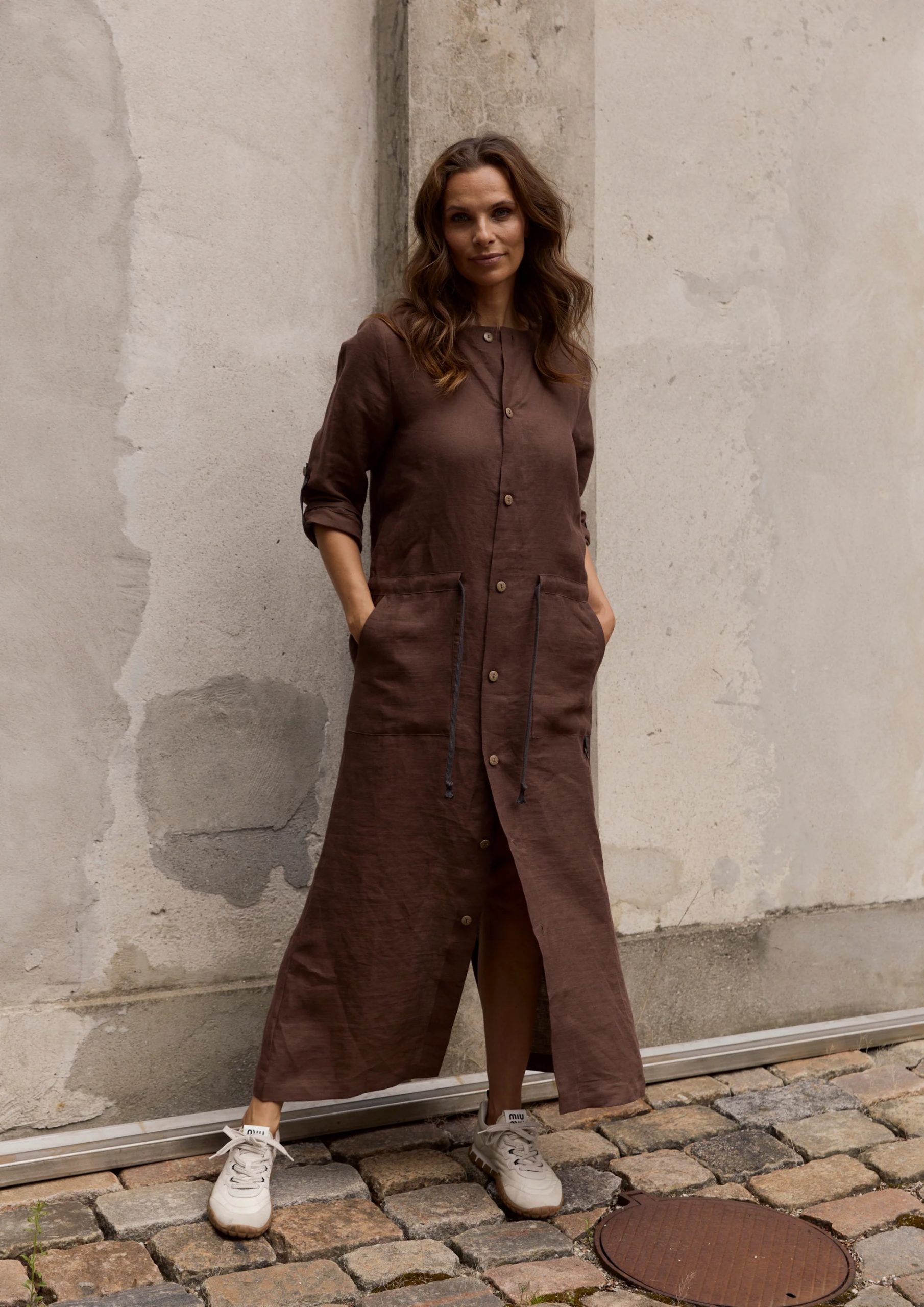 A long dress designed with a straight, relaxed silhouette and a clean, functional feel. Buttoned through the front for versatile wear and an easy, timeless look. Can be worn as a long jacket but also as a long shirt-dress