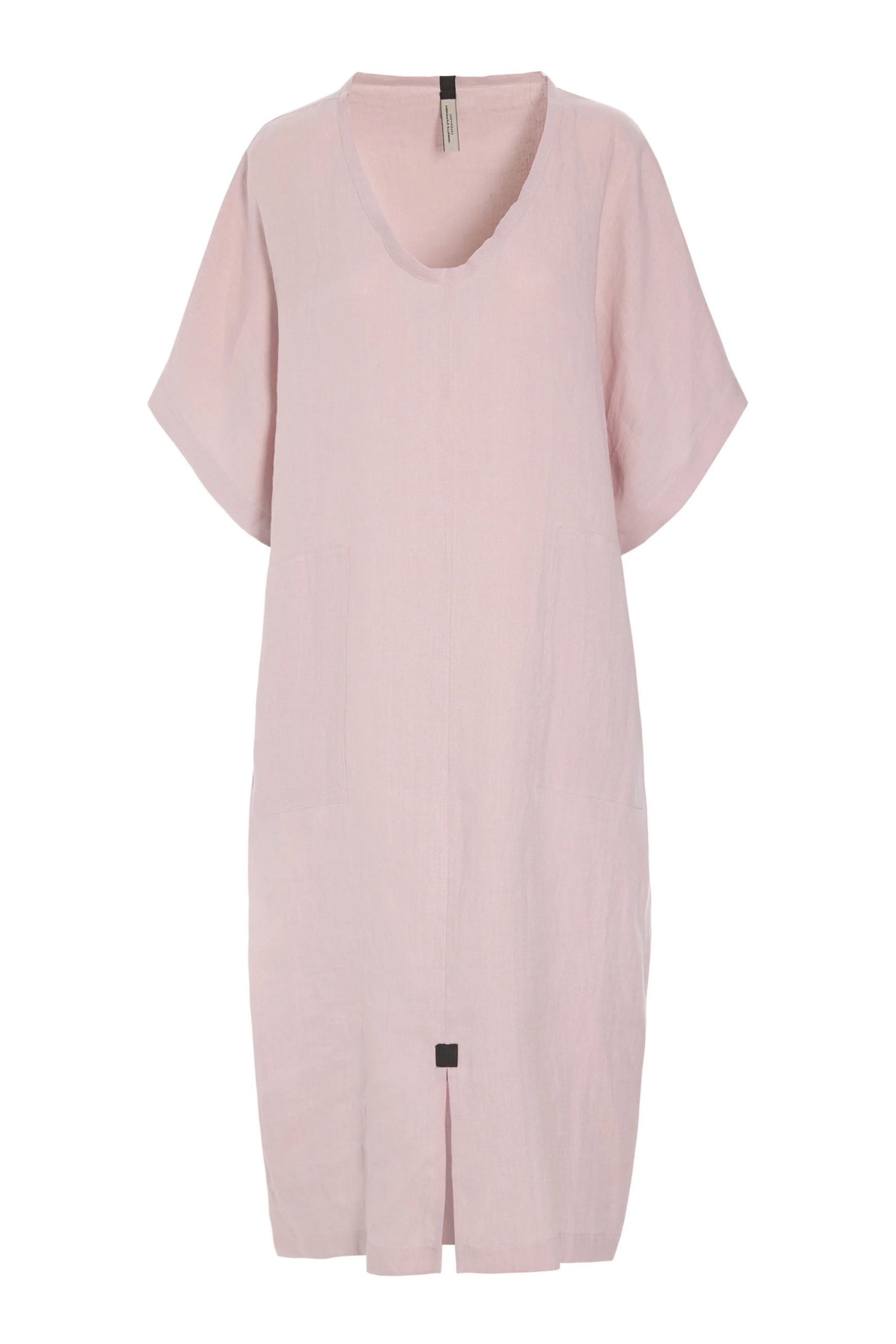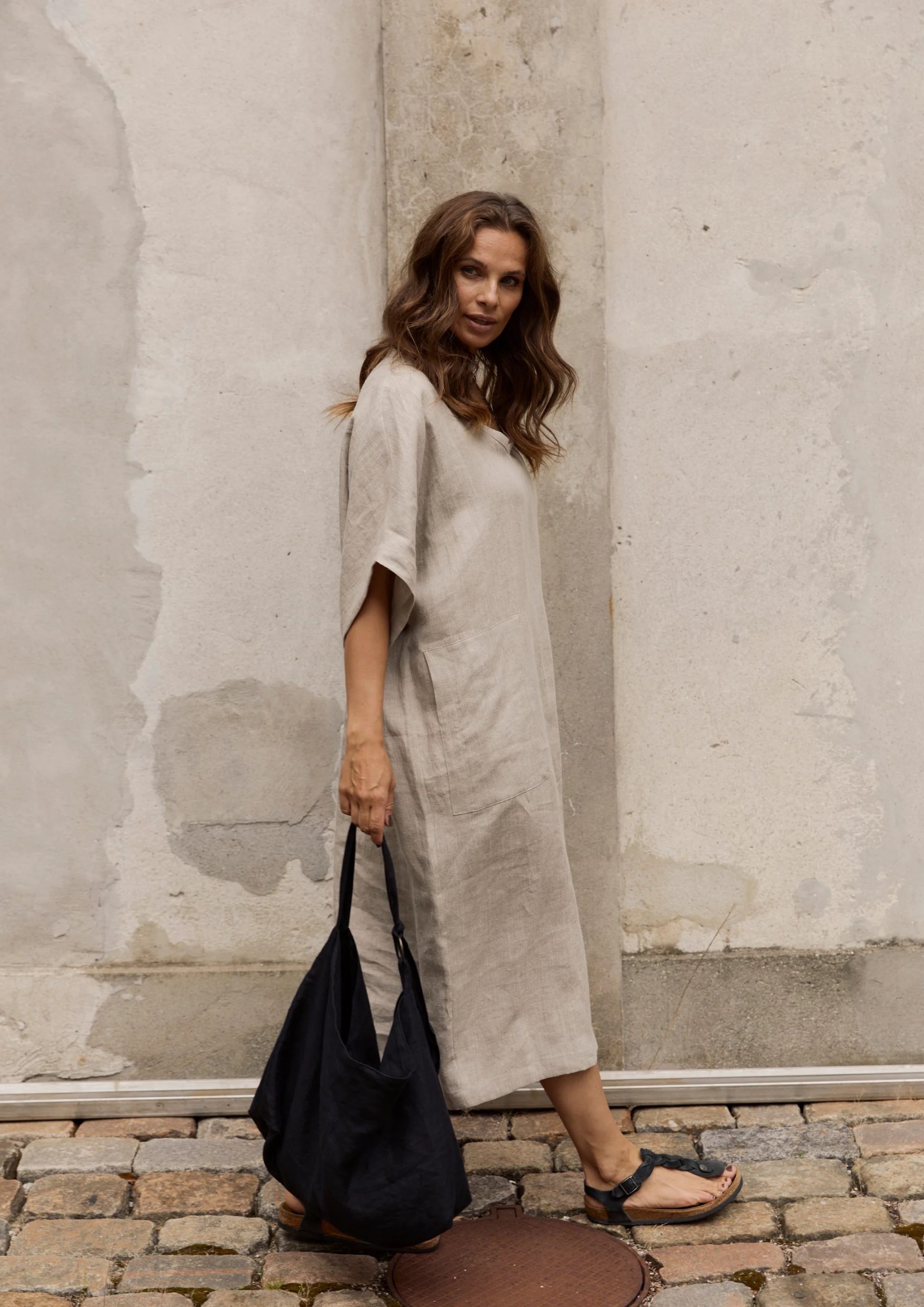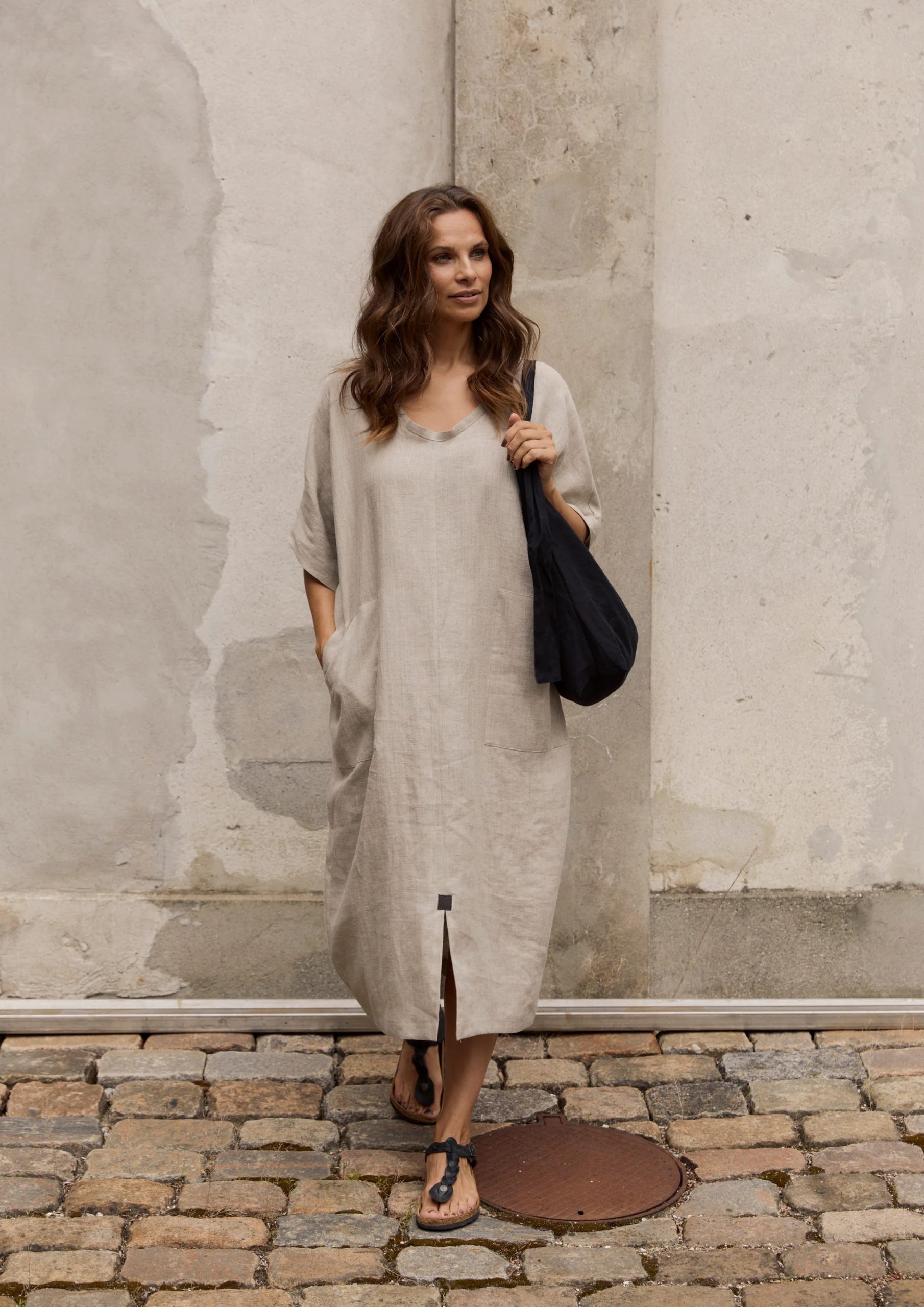 A midi-length dress with a straight, relaxed silhouette. Designed with wide sleeves that fall just below the elbow and a softly rounded neckline, sitting between a U-shape and a gentle scoop. Finished with a front slit for ease of movement and side pockets for a practical and cool detail.
