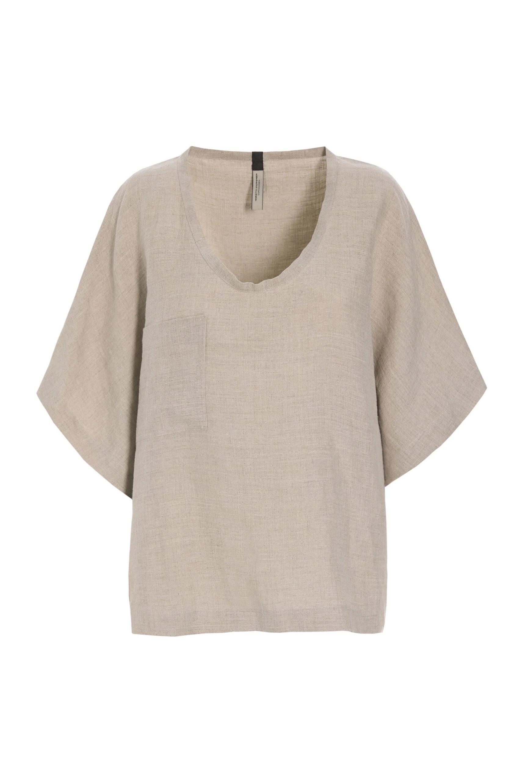 A cropped blouse with a relaxed, boxy shape and wide sleeves that reach around the elbow. The softly rounded neckline, sitting between a U-shape and a gentle scoop, brings lightness to the design.