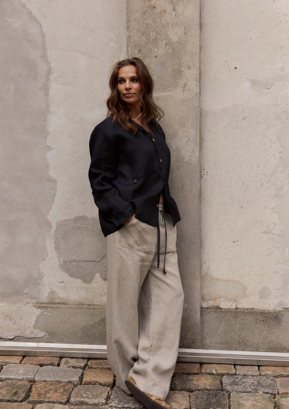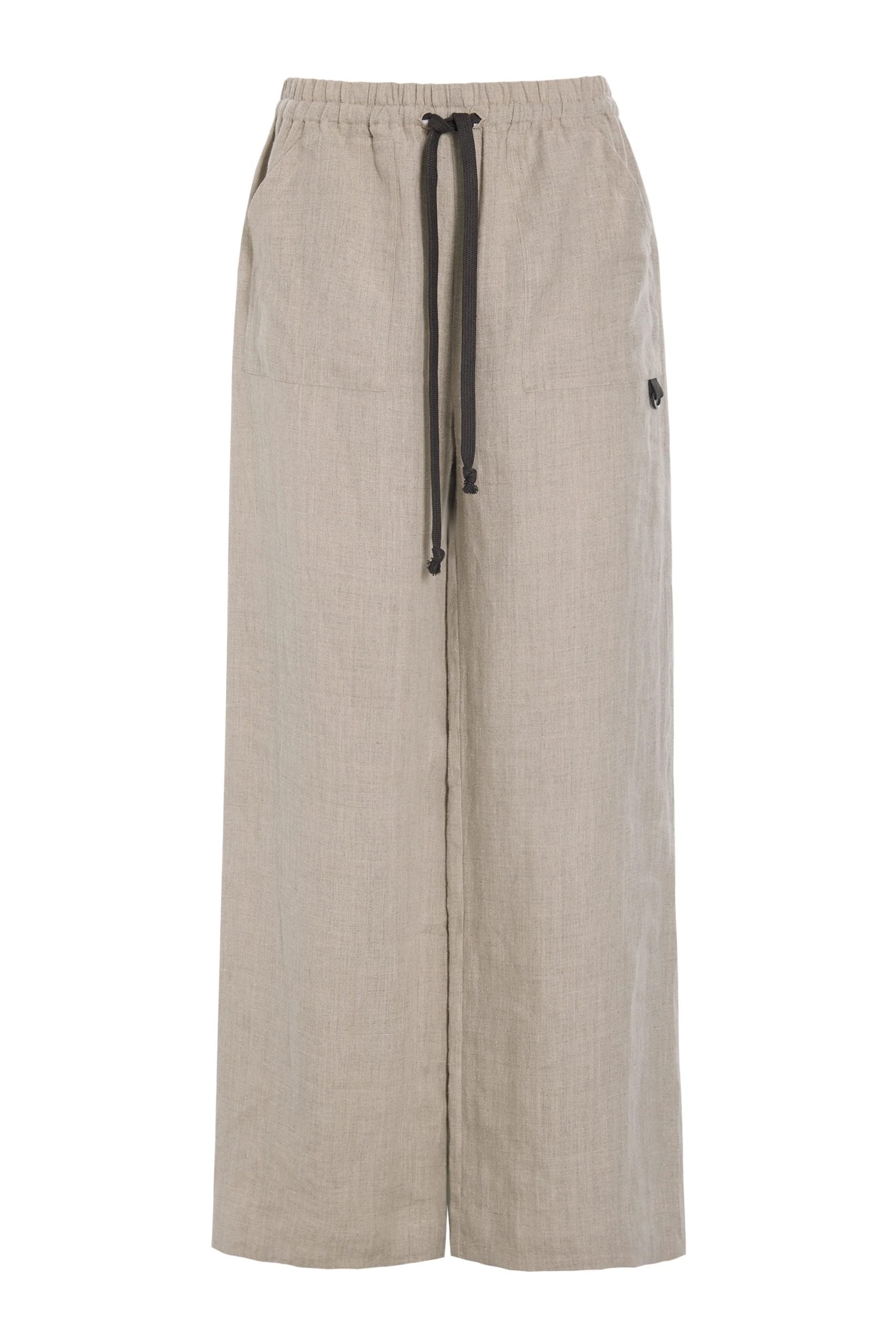 Hemp pants with a light and relaxed expression, shaped with flared legs in a full-length silhouette. Designed with practical side pockets and finished with ties at the front for an easy, adjustable fit. Loose fit.