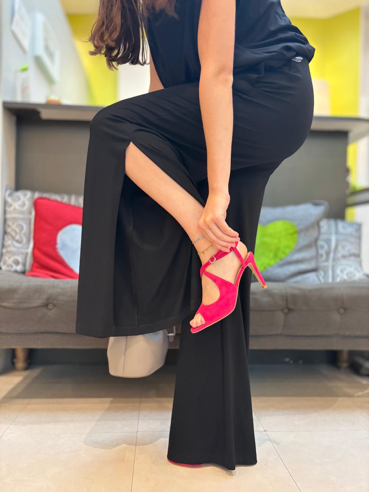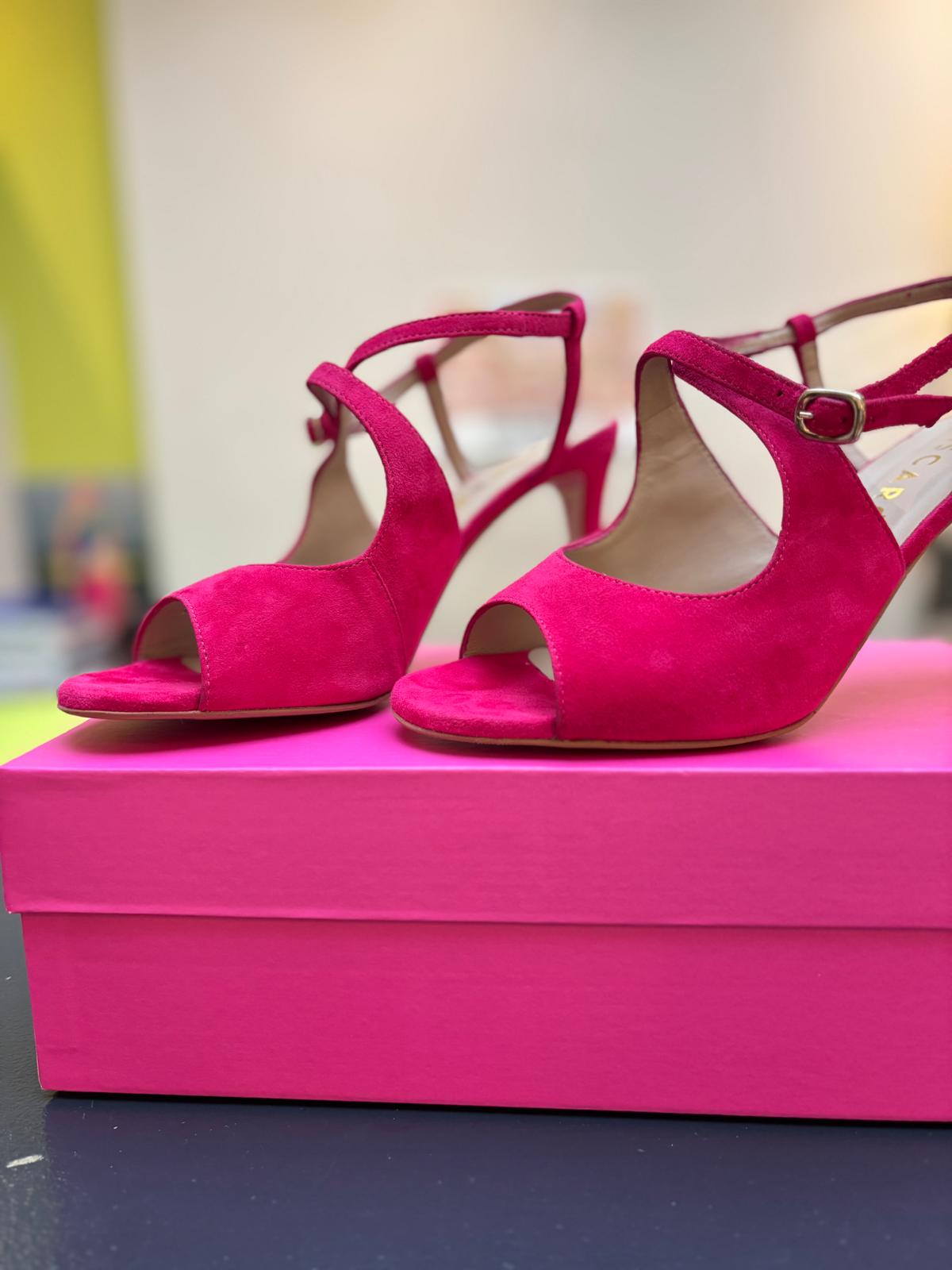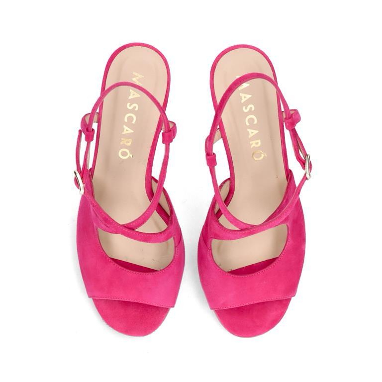 Sophisticated sandal with 9cm heel in hot pink suede with rubber sole, leather insole and lining.
