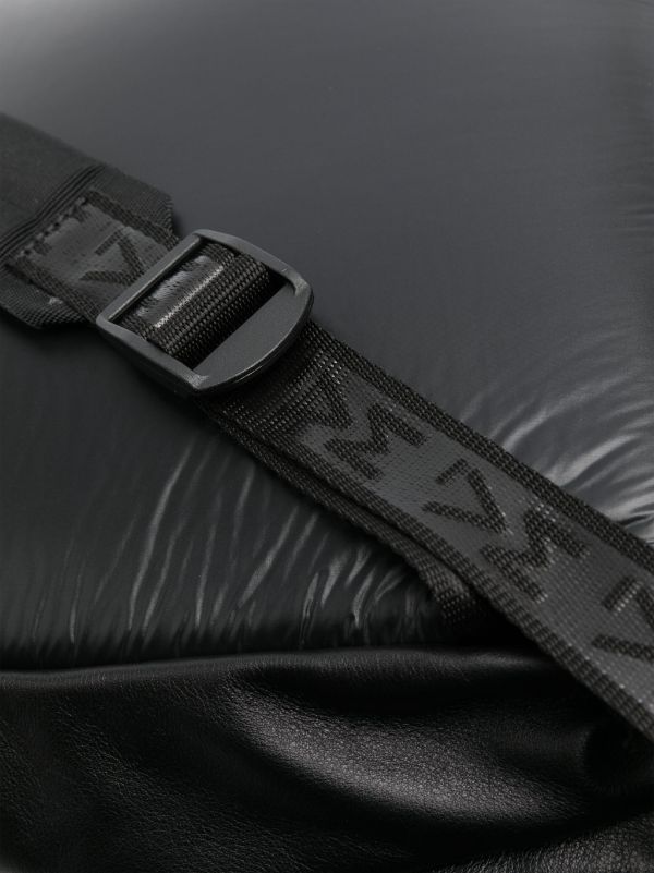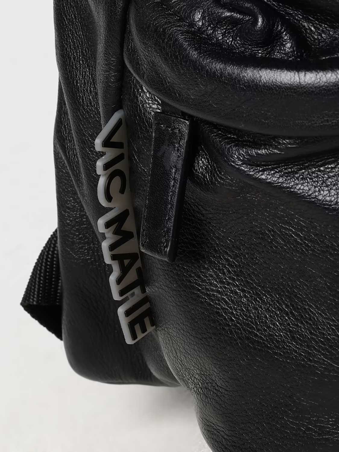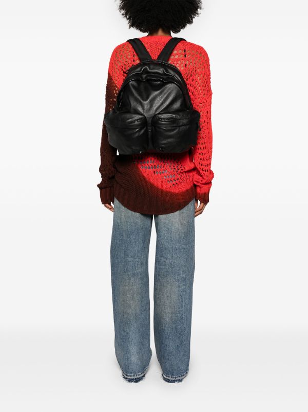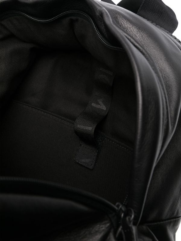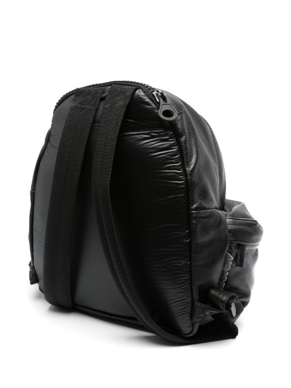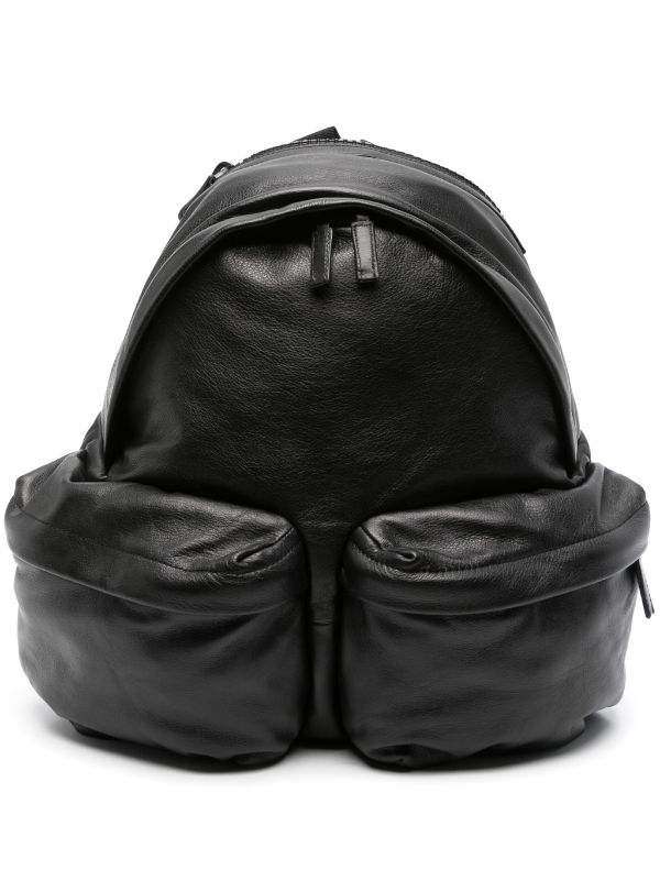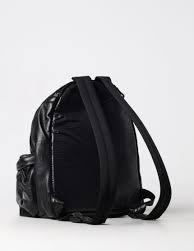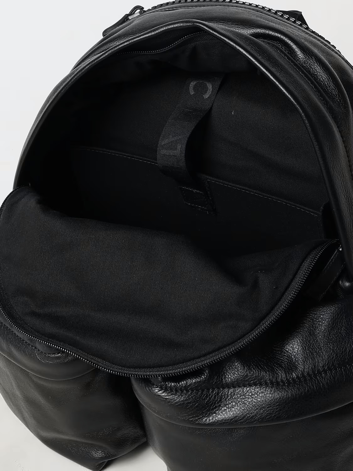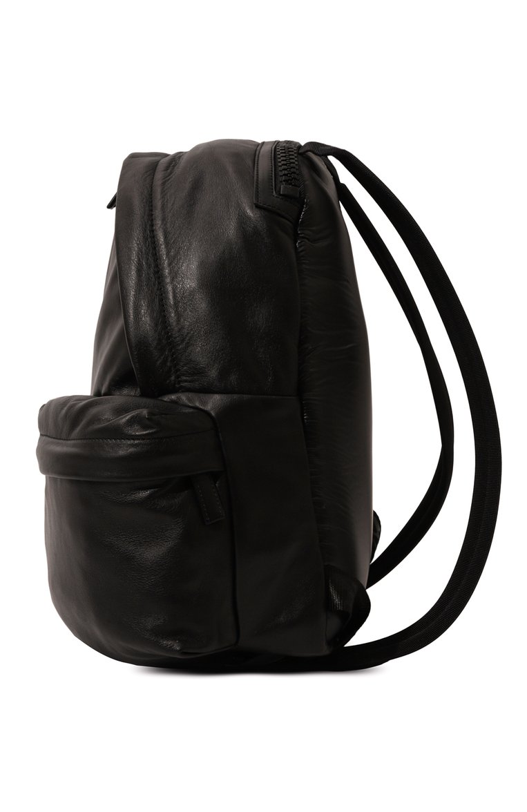 Black pleated backpack in soft nappa calfskin. Vertical front pocket with large metal zip, leather handles and shoulder straps, and second non-snag large pocket at the back. Metal logo on the front.